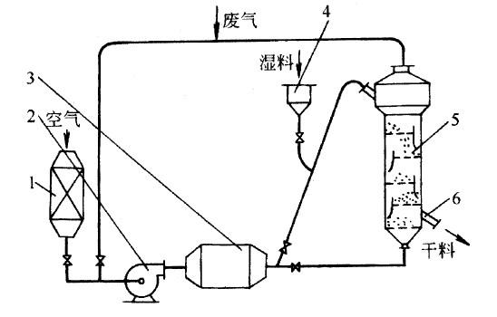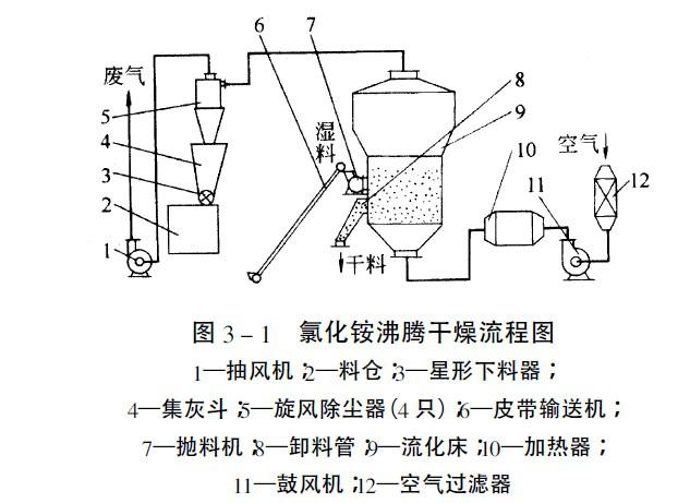 工艺流程和主要设备如图3-1所示。湿物料由胶带输送机送到抛料机的加料斗上,再经抛料机送入振动流化床干燥机内。空气经过过滤器由鼓风机送入空气加热器,加热后的热空气进入流化床底部分布板,干燥湿氯化铵。干燥后的氯化铵经溢流口由卸料管排出。干燥后空气夹带的粉尘经4个并联的旋风除尘器分离后,由抽风机排出。生产操作条件:进风温度150-160摄氏度。 排风温度50-60摄氏度 颗粒度40-60目 操作气速 床层高度 操作风量3000立方 床层压力600-700Pa(负压 负压) 操作压力损失 物料停留时间 多层振动流化床干燥机单层振动流化床干燥机的缺点在于干燥后所得产品湿度不均匀。为改进此缺点,出现了多层振动流化床干燥机。如五层振动流化床干燥机干燥涤纶切片。其工艺流程和主要设备如图3-2所示。