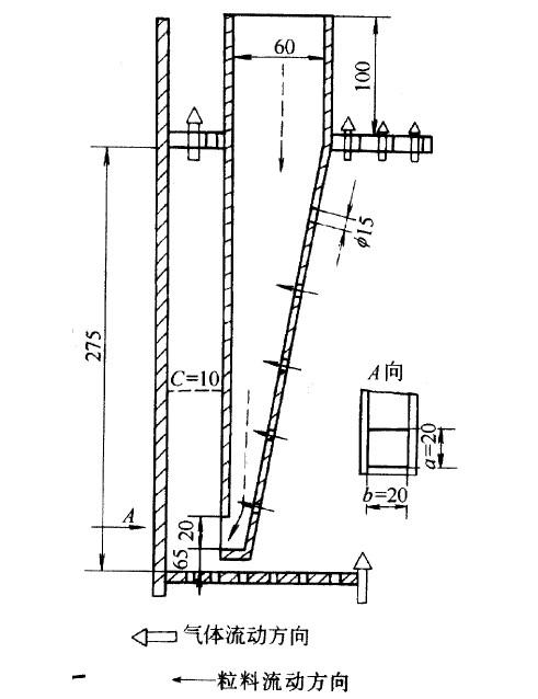 图3-3溢流管调节装置 (2)铰链活门式[图3-3(b)] 根据溢流管中物料量的多少,可自动开大或关小活门。但需注意活门轧死而失灵。 (3)自封式溢流管(图3-4) 自封式溢流管采用侧向溢流口,其空间位置设于空床气速较低的床壁处(以保持溢流口仍为较小控制面为原则),再加上侧向溢流口的附加阻力,使气体倒窜的可能性大为减小,即使将溢流口埋入浓相床层中,也不会引起气流对下料的干扰。自封式溢流管采用不对称方锥形,既可防止颗粒架桥卡料,又可因截面自下而上不断扩大而气速不断降低,减少喷料的可能性。在溢流管内颗粒空隙间流动的气体,能起松动物料的作用,为此,可在溢流管侧壁上开一串侧孔(其开孔率选取等于分布板的开孔率),由床层内自动引入少量气体作为松动风,不需另设风源。至于溢流管的具体尺寸要根据实际生产情况进行实验决定。